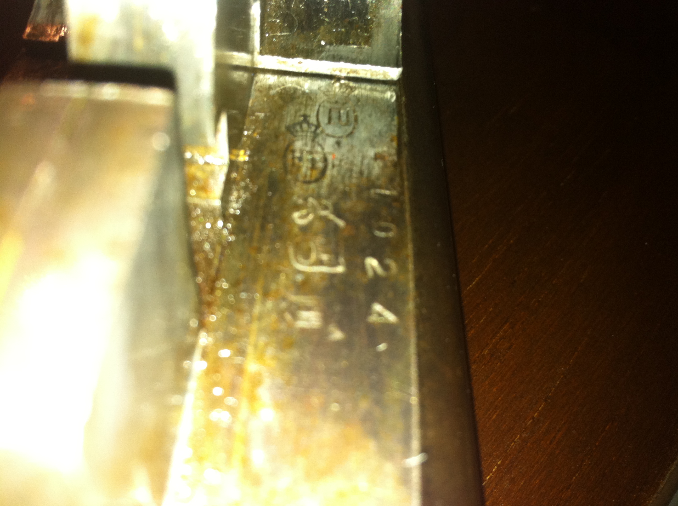 Lo unico que puedo distinguir es un escudo con una X al centro , una especie de escopetas cruzadas con un 2 por delante , luego la mas confusa que puede ser un "8P" y la ultima figura es una "CH".( se puede apreciar en la foto 2).