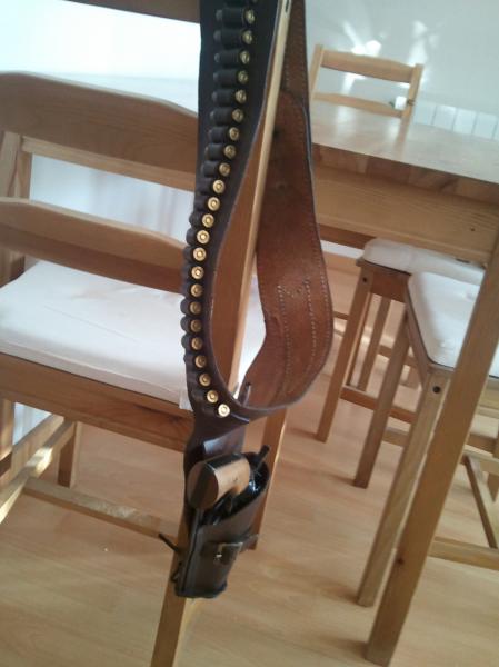 y una imagen de la pistolera y el revolver, trucada, por debajo proyectiles de plomo pegados y por arriba casquillos de 9 mm knall