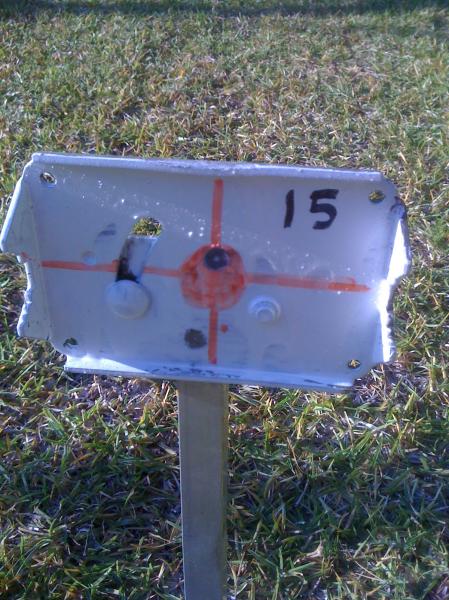 A 30 MTS HE TIRADO TAMBIEN UN AMIGO QUE NON TIENE MUCHA PRATICA,MI TIRO ES EL AGUJERO EN LA RALLA VERTICAL.