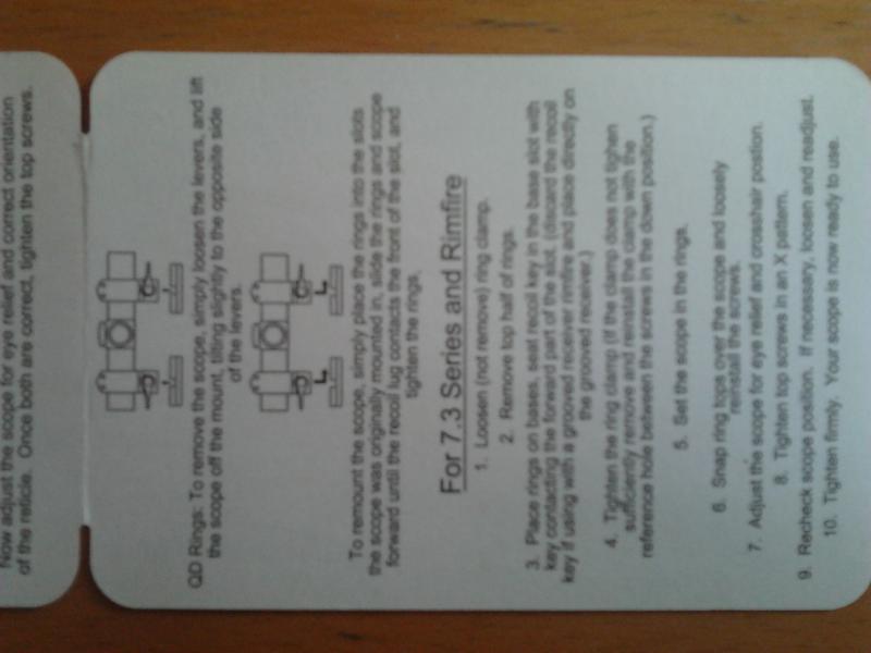 "Con el visor suelto dentro de las anillas (se refiere a que los tornillos de abajo esten apretados pero los de arriba y la palanca esten flojos), empuje una anilla hacia delante hasta que el recoil lug toque totalmente contra la ranura. Apriete la palanca, y vuelva a hacer lo mismo con la otra anilla".