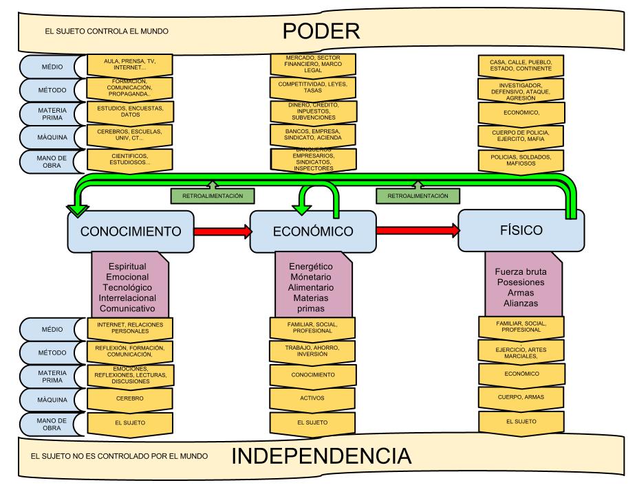 Con el de conocimiento podemos conseguir el poder económico, y con este el físico. Con el físico no se puede conseguir ninguno de ellos.