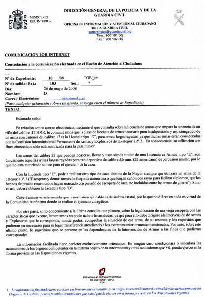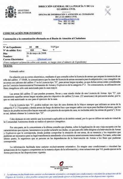 y gracias tambien al compañero acmes por sacarlos a la luz si bien, despues de leerlos, creo que no podrán despejar las dudas que originan este hilo. El escrito informa de como debe guiarse un arma del 17HMR - con una licencia tipo "D" - y de su reglamentación para usos cinegéticos, pero no aclara como hacerlo cuando la carabina en cuestión ya esta guiada previamente con la "E" lo que ¿imposibilita? que el añadido un nuevo cañón cambie la categoría de la misma según el famoso Art. 89.4 del reglamento.