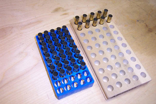 Pues tendrás que hacerte con una bandeja para colocar las vainas boca-arriba, hacerte una bandeja con una tabla de madera o usar un plástico (con los agujeros adecuados al diámetro del culo de la vaina que quieres recargar) donde vienen colocados los cartuchos en las cajas de munición "factory" (Yo para cargar el 30-06 sujeto las vainas en un plástico de una caja de cartuchos del 44-40) e ir colocando el embudo en la boca de cada vaina con el cuello ya expandido y llenandolas una a una, y una vez todas llenas y comprobadas, ir despachándolas a la prensa para poner la punta.
