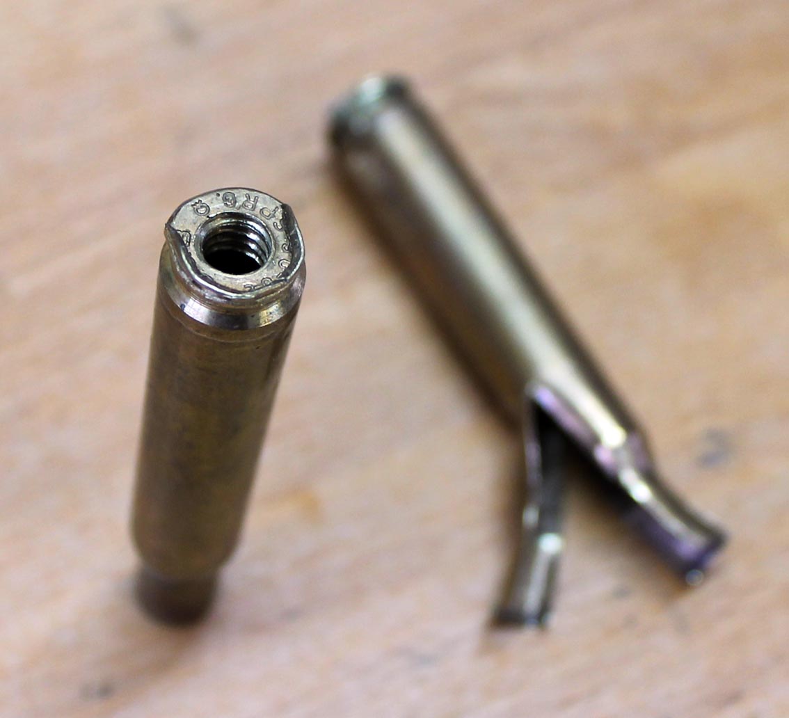 Resultado, me cargué la punta del desempistonador de Lee, pero el de Hornady no se rompió porque se desmontó, dejando dentro de la vaina la parte que ajusta el interior del cuello. Después corté la vaina con las tijeras y lo saqué. Os dejo unas fotos.
