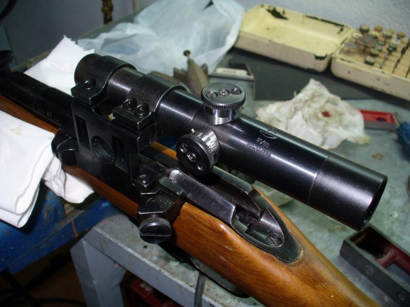 Por si alguno piensa que hecho un "sacrilegio" con montarle un visor, os digo que no creo que sea así, ya que mi rifle en concreto está hecho a retales: no hay coincidencia entre los números de serie del cañón, cerrojo, almacén de cartuchos y cantonera, al tiempo que las maderas creo que corresponden a un M44, ya que tiene el rebaje lateral para la bayoneta, con lo cual el valor histórico que puede tener es dudoso.