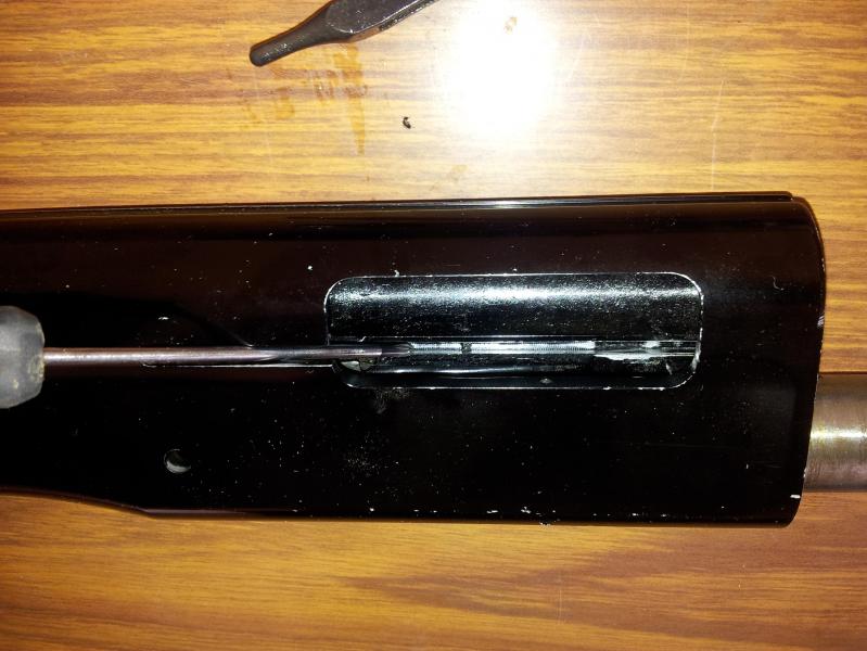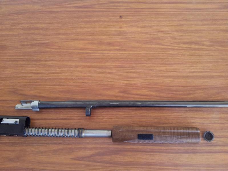 primero, comprobamos que no tenemos ningun cartucho ni en la recamara ni en el deposito, es obvio, pero creo que no esta demas decirlo, y empezamos por el guardamanos, quitando la rosca y, aviso si es la primera vez, cuidado no nos salga el cañon disparado porque debido al sistema de salida de recarga, este va suelto y al quitar la tuerca del guardamanos, se nos puede caer.