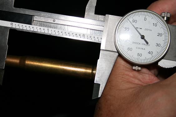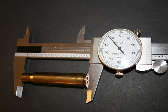 Antes de empezar, he comprobado que la vaina esté dentro de las medidas SAAMI: 2.484" mínimo y 2.494" máximo. Es muy importante en lo que respecta al mínimo porque no conviene hacer fuego con un cartucho corto en una recámara hecha con esas cotas oficiales. Y si es largo ya sé que voy a tener que trimarlo hasta dejarlo dentro de ellas.