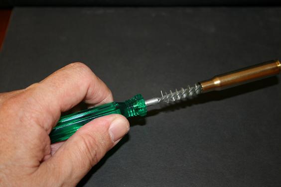 Como vamos a pasar a recalibrar, conviene limpiar bien el interior del cuello para que nada se interponga entre la oliva y la vaina. Hay que recordar cómo funciona un die. La vaina, y sobre todo el cuello, están expansionados y amoldados a la recámara. Es relación macho-hembra.