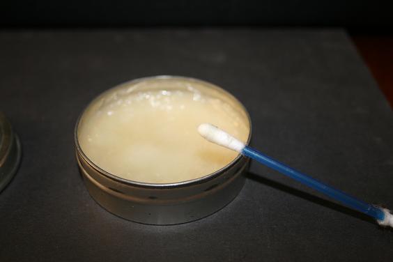 He adjuntado una foto del color que tiene el hisopo tras aplicar la cera. Casi blanco, lo que quiere decir que quedó bastante limpio cuando le pasamos la escobilla esa del mango verde.