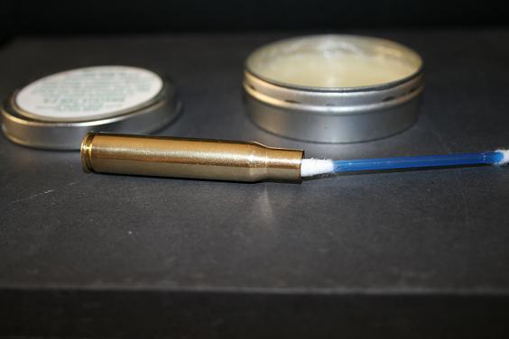 Se aplica sencillamente con los dedos en el exterior. Por dentro del cuello, que es donde la oliva del die fuerza más la vaina y de donde la estira, me tomo la faena de aplicarlo con un hisopo; si lo aplicas bien, puede que ahorres alguna milésima de estiramiento. En todo caso, es un mimo que le haces al material, porque parte del stress del recalibrado se lo transmites al die.