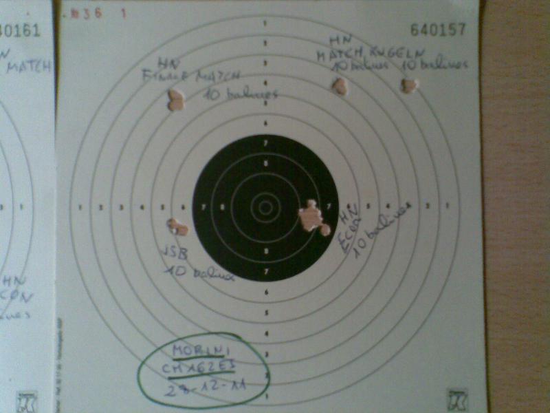 Hola. Supongo que muchos de los tiradores de precisión aire a 10 metros nos hemos preguntado con qué marca de balines deberíamos tirar para agrupar más y mejor y subir de puntuación. Sin ánimo de menospreciar las demás marcas de balines, hice unas pruebas con las pistolas sujetas a un banco de trabajo y el resultado es el que observáis en las fotos. Se dispararon 10 con cada marca, eso sí moviendo el blanco, como es de suponer y la diferencia entre las rosas de tiro las podéis apreciar más o menos claramente. Las pistolas utilizadas son steyr lp 10 e y morini cm 162 ei. Espero aclarar alguna duda sobre los balines con esta prueba porque existe diferencia de precio entre unos y otros. Un saludo.