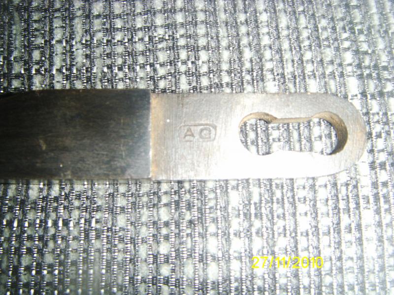 hace unos años cayeron en mis manos algunas bayonetas, una de mosin nagan, otras dos de mauser y otra que no me suena nada, debe ser de algun fusil moderno, la verdad ni idea.no tiene mango, parece de acero, solo tiene las iniciales AG. mide 37cm.i tiene dos acanaladuras. mando un par de fotos a ver si le suena a alguien. muchas gracias.