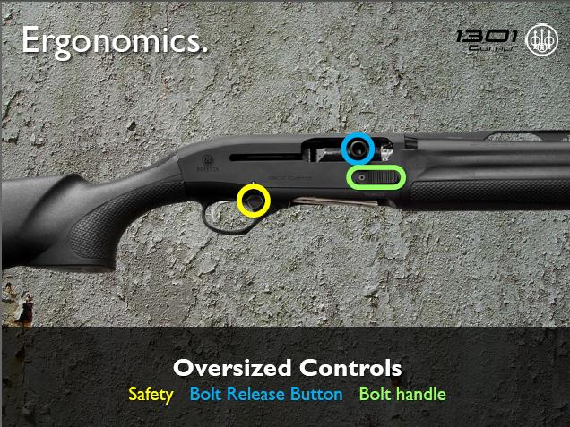 La Beretta 1301 es un arma diseñada exclusivamente para la competición y todos sus elementos siguen esta pauta, sus elementos de manejo están sobredimensionados para que la rapidez de ejecución sea lo más efectiva y simple posible.