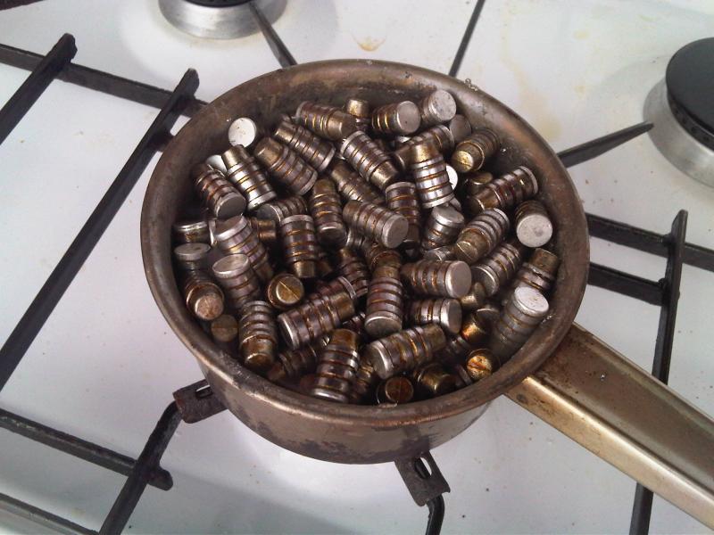 En este caso he utilizado el plomo de unas balas del .357 con gas-check que fundí años atras y que nunca llegaron a satispacer mis expectativas en cuanto a precisión.