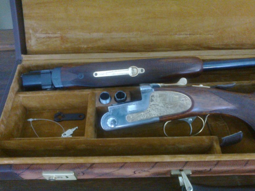 Superpuesta,calibre 20,recamara 76Magnum,cañón 66cms con polichoques,escopeta pesada de 3400-culata con camara a 37'3cms,curvatura de 5'50cms,disparador único selectivo,con pletinas decorativas,modelo SARRIUGARTE fabricado en Diarm.