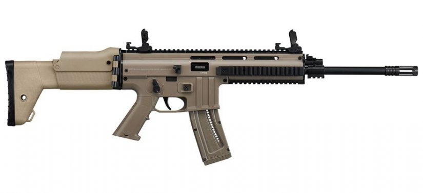 Equipada con culata plegable, empuñadura tipo pistolet y cargadores de alta capacidad (hasta 22+1 cartuchos del calibre .22lr), esta carabina sigue guardando un incuestionable parecido estético con el fusil de asalto FN SCAR.