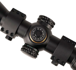 En los modelos más enfocados hacia la caza, como el 1-6x24 o el 1.7-10x40, las torretas de ajuste vienen con tapas protectorasOtro modelo que también destaca por ofrecer un notable rendimiento en diferentes disciplinas es la versión 2-12x44. En este caso, nos encontramos con el primer visor de la gama que incorpora una tercera torreta lateral, la cual permite ajustar el paralaje desde 10 metros hasta infinito. Esta característica, unida a su rango de 2 a 12 aumentos, hacen de este modelo una mira óptima tanto para competiciones de tiro deportivo que requieran un alto zoom para ver con nitidez el blanco, como para disciplinas de caza que también precisen un disparo sosegado de cierta distancia. Al igual que el modelo anterior, este PRS 2-12x44 también dispone de la retícula Target Dot (en este caso el módulo que regula su iluminación va colocado sobre el ocular), y unas torretas de corrección de 1/4" a 100 metros.